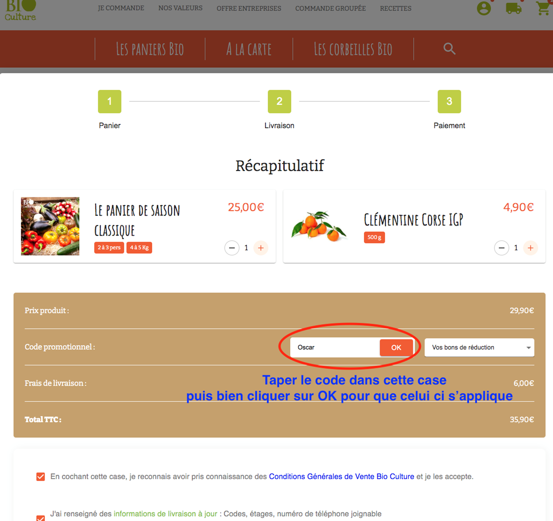 Pensez à indiquer le code de réduction avant de régler sur la ligne Code Promotionnel :