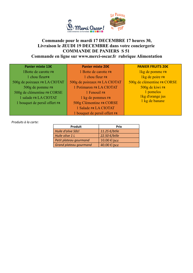 PROCHAINS PANIER APRES LES FÊTES LE JEUDI 16 JANVIER
